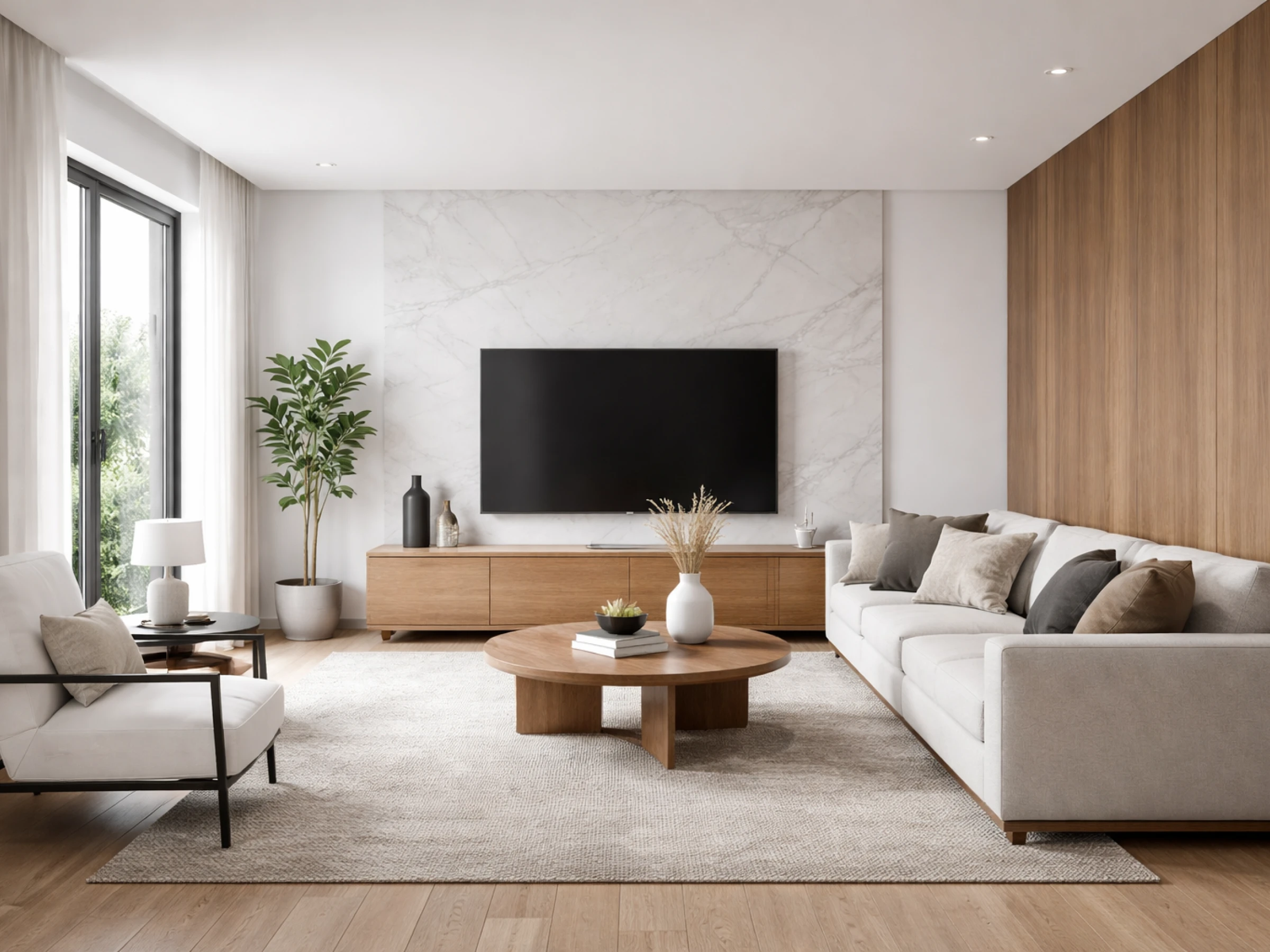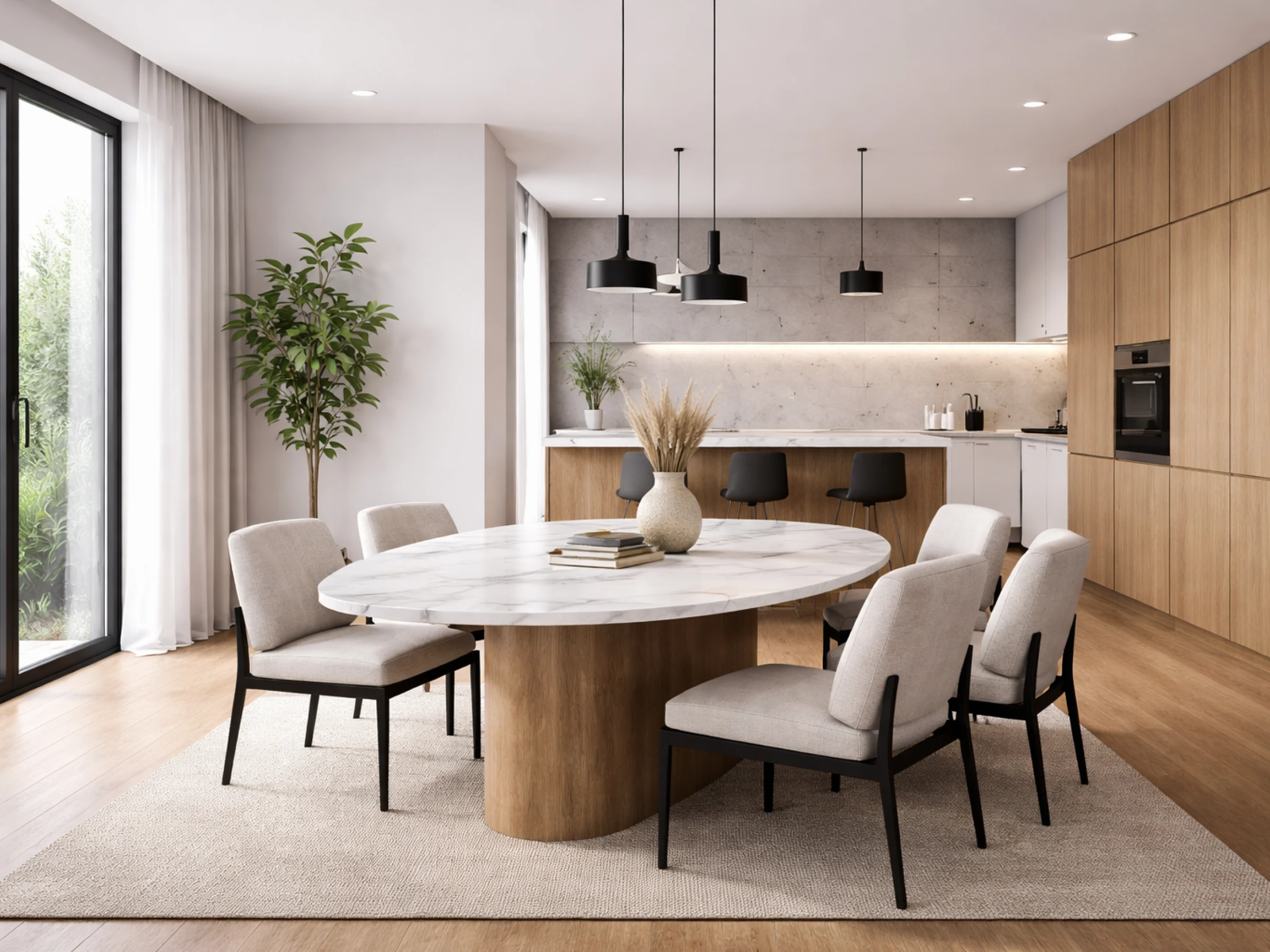 Die Materialien im modernen Stil wirken hochwertig und ausgewogen. Marmor bildet eine elegante Grundlage und bringt eine ruhige, edle Oberfläche in den Raum. Heller Beton ergänzt diese Wirkung durch eine klare, sachliche Struktur. Schwarzer Stahl setzt präzise Akzente und sorgt für klare Linien. Leinen bringt eine weiche, natürliche Haptik ein, während Holz in hellen bis mittleren Tönen Wärme und Struktur ergänzt. So entsteht ein stimmiges Gesamtbild, das Klarheit und Beständigkeit ausstrahlt.
