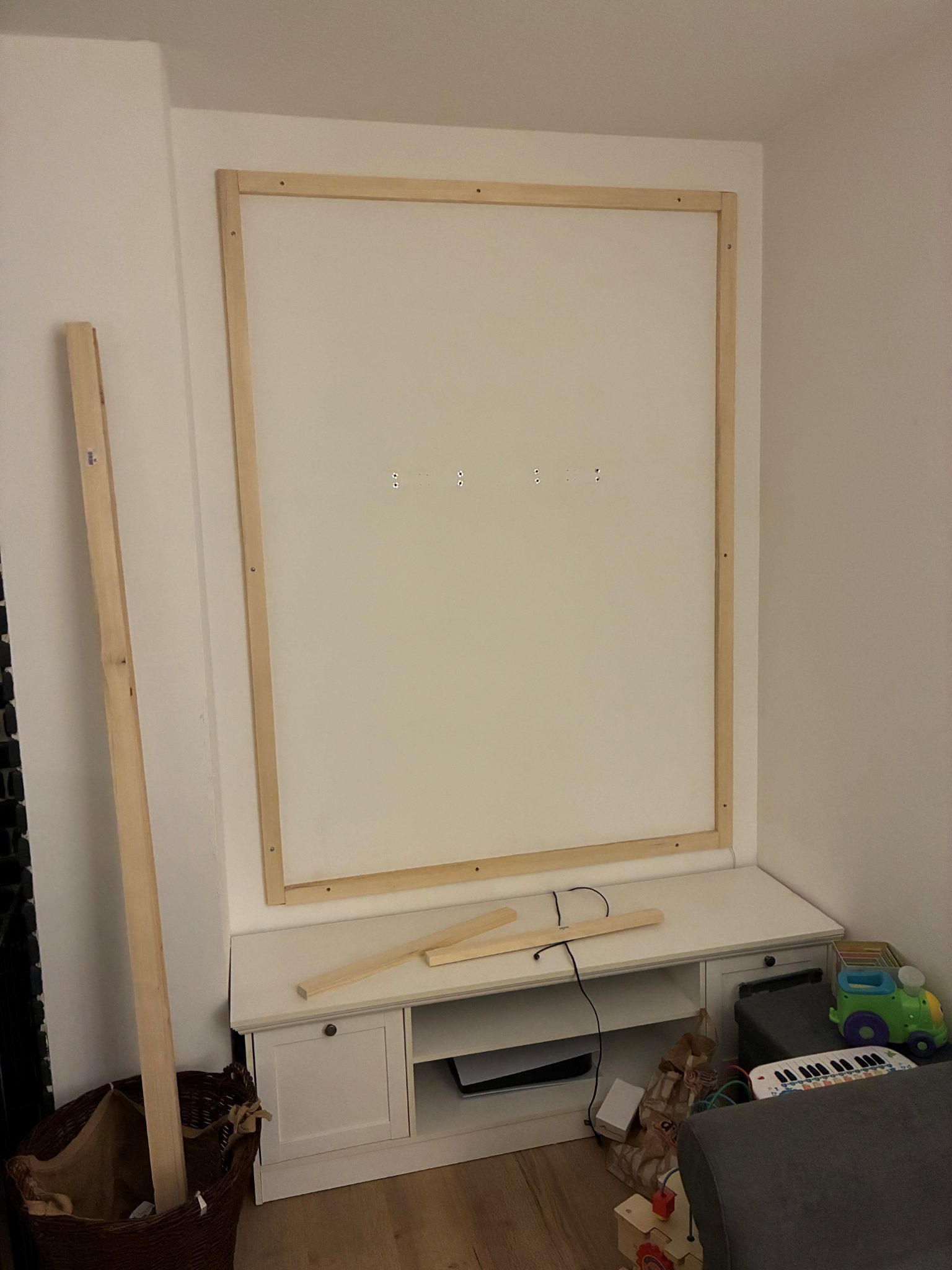 Aus vier Latten habe ich einen rechteckigen Rahmen gebaut und ihn in der Nische probeweise angesetzt. Danach habe ich die Positionen für die Bohrungen markiert und geprüft, dass alles gerade sitzt. Dabei habe ich nach Links/Rechts den gleichen Wandabstand aber nach Oben (24cm)/unten (12cm) einen anderen. Das ist für die optische Zentrierung, damit das Element für das Auge mittig wirkt, obwohl es geometrisch nicht exakt mittig sitzt.