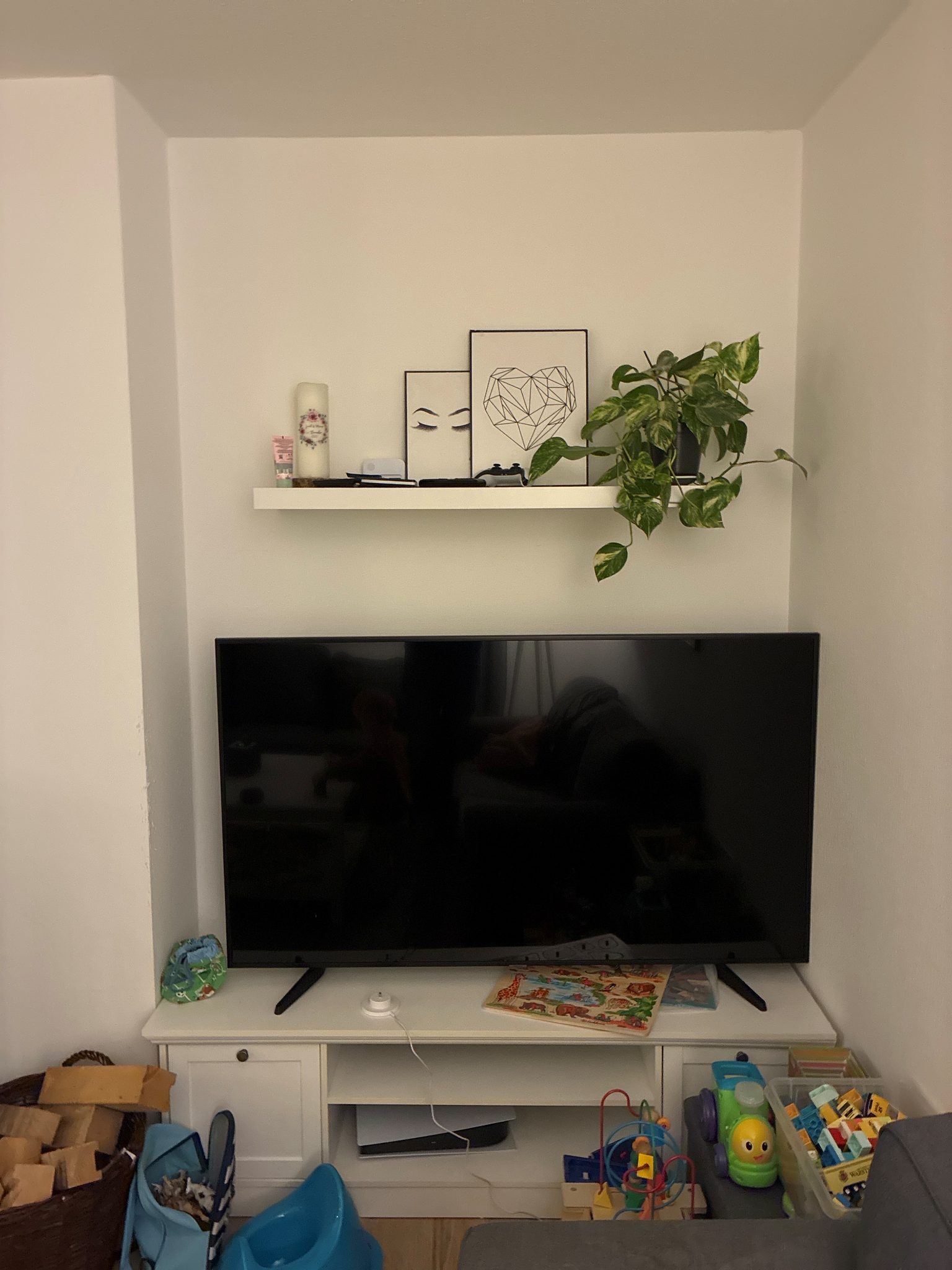 Ich habe die Nische ausgemessen und die sichtbare Paneelfläche definiert. Rundum habe ich bewusst Platz gelassen, damit das LED Licht später als gleichmäßiger Lichtkranz an Decke, Seiten und unten sichtbar wird. Unten habe ich den Kabelweg geplant, damit das Kabel später hinter dem Fernseher und im Lowboard verschwindet.